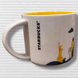 Starbucks "You Are Here" collection mug from 2012, featuring a New York City skyline design. The mug is made of ceramic and holds 14 ounces. It has a white exterior with a yellow interior and depicts iconic New York City landmarks such as a yellow taxi, the Brooklyn Bridge, and the Empire State Building.