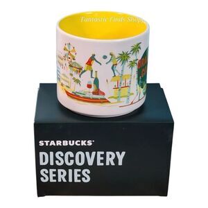 Starbucks Discovery Series Orange County Full Size 14 oz. Mug NIB Indulge in your favorite beverage with this Starbucks ceramic mug, featuring a sleek white exterior and a vibrant yellow interior. The mug showcases a delightful palm tree design, making it a perfect addition to any dining collection. Ideal for both coffee enthusiasts and collectors, this mug combines functionality with a touch of tropical charm.
