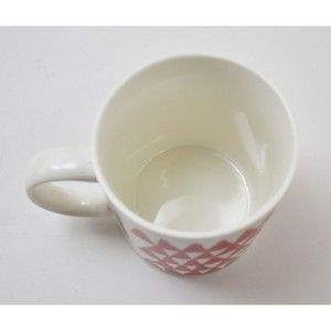 White Starbucks 2016 holiday mug with red triangle trees. Measures 3-1/4" across the top, 3-1/8" across the bottom and is 3-3/4" high.