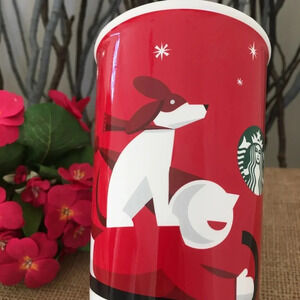 Starbucks 2011 Winter Scene Mug. Shows boy with dog sledding. Primarily red with white. Ceramic.