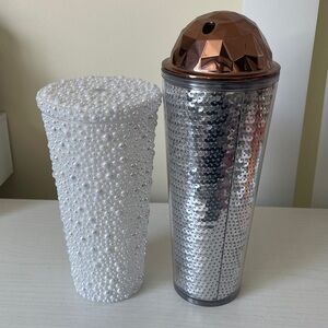 Elegant Starbucks tumblers. One features a silver design with a copper geometric lid. The other is adorned with white pearls. Both in great condition and will come without straws