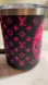 Stylish mug w/iconic Louis Vuitton pattern. Features vibrant pink designs on a sleek black background. Perfect 4 coffee or tea lovers.