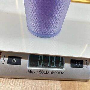 This 24oz Starbucks tumbler showcases a striking purple-to-blue ombre gradient with a studded texture. Includes matching lid and straw for stylish hydration.