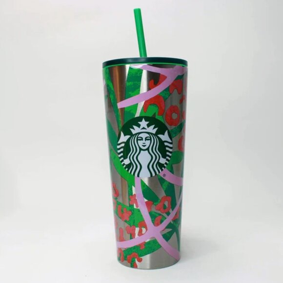 (1)Starbucks Summer Leopard Jungle Stainless Steel Floral Tumbler in the middle of the first image.