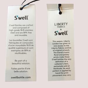 The front has a subtle print in silver near the bottle that reads "Liberty Fabrics & S'well". Tag indicates: "This season, Liberty London has given us rare access to the Liberty Fabrics archive of original artwork. The brand's iconic floral and paisley prints made these S'well bottles the very definition of a collector's item, exclusively sold at Starbucks. As each pattern is applied by hand, the print placement may vary.
