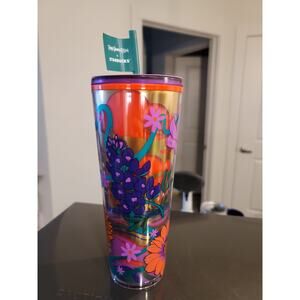 The latest from the limited edition Starbucks Artist Collaboration by Austin based Rex Sterling Hamilton features dopamine colorful wildflowers of Texas on a metallic gold background with a violet bluebonnet as the star of the show and green ribbons through out. Doubled walled tumbler