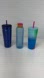 Set of three Starbucks drinkware items. Includes a blue tumbler, a frosted bottle with pink and yellow cap, and a multicolor tumbler with gradient design.