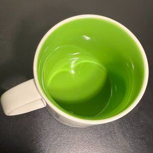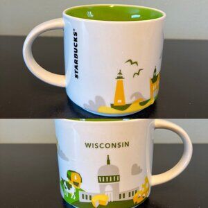 Starbucks WISCONSIN mug from the YOU ARE HERE collection (2007) features a wraparound design with symbols of the Badger State, including many highlighted in the Green Bay Packer Football colors of green and yellow: The State Capitol Building in Madison, wedges of cheese, Holstein cows and a barn, a football, the University of Wisconsin, and a Lake Michigan coastal lighthouse. Vertical text reads STARBUCKS and horizontal text reads WISCONSIN. Green interior. Microwave and dishwasher safe. Measures 3.5” tall with a 3.75” diameter. Holds 14 fluid oz.