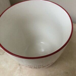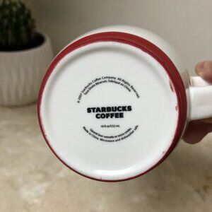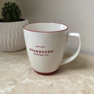Classic Starbucks mug. White body with red accents. Perfect for coffee lovers.