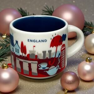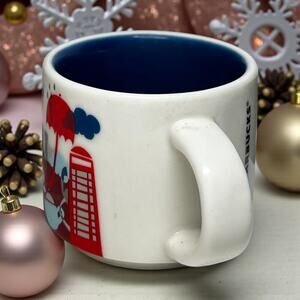Collectible Starbucks You Are Here Collection mini ceramic espresso mug featuring England. This 2 oz demitasse mug ornament showcases charming England-inspired artwork and includes a deep blue interior, making it perfect for collectors or holiday décor displays.