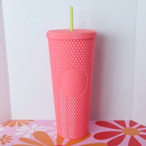 Starbucks coral studded 24oz tumbler with neon yellow straw