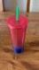Berry pink purple on the top and gradually goes to a purple blue color. Grid jeweled pattern in cup and lid