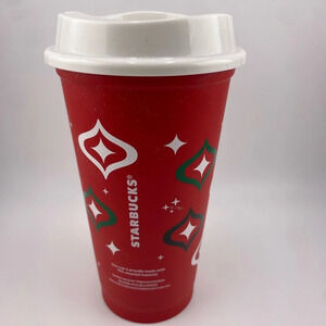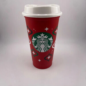 This festive Starbucks coffee cup features a vibrant red color adorned with white snowflakes and stars, perfectly capturing the spirit of the holiday season. The iconic Starbucks logo is prominently displayed, making it a delightful choice for enjoying your favorite seasonal beverage.