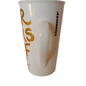 Very nice 16 ounce Starbucks mug in excellent condition. Approximate dimensions: 6" tall, 3.5" diameter at rim.