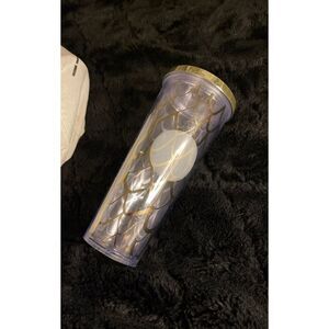 Starbucks venti(24oz) mermaid scale gold & cleAr acrylic tumbler/coffee /hot & cold double walled insulated beverage cup in a highly sought after style features metallic shimmering gold mermaid scales she and circular ad gloss like logo this style is highly sought after & sold out!! Part of their mermaid/siren inspired line of tumblers w/ a little sparkly bling for fun! Very glam fits any personality or home decor! There are a few cosmetic imperfections(see pictures- small crack on bottom & chipping on bottom sole of cup & light scratches throughout etched logo can be fixed) they do not affect the use of the cup however(meaning no liquid spills out! ) double wall still intact( meaning no annoying water and drips inside when trying to wash- hand wash only of course) - If you have any questions please feel free to message me I accept bundles and also offers
