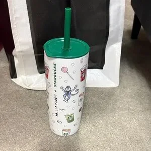 Chic tumbler featuring whimsical designs. Comes with a green lid and straw.