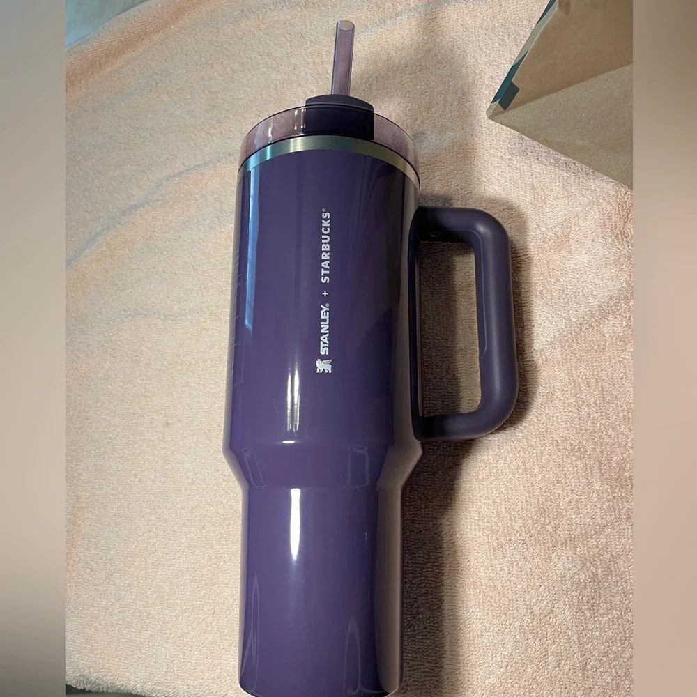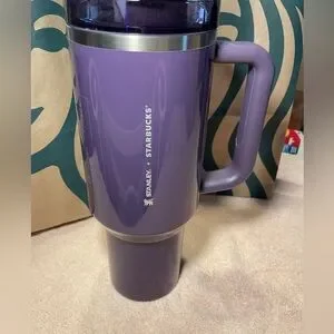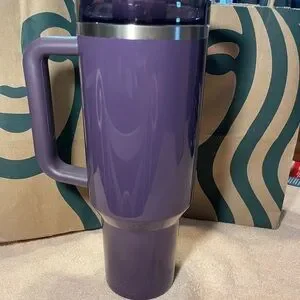 Elegant deep purple tumbler with sturdy handle. Includes straw for convenient sipping.