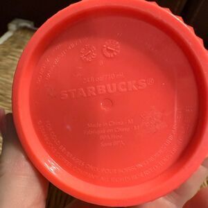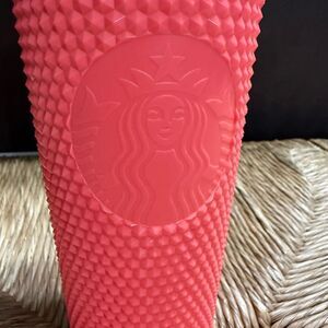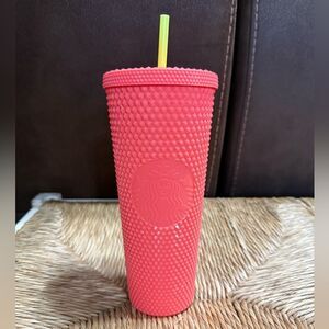 Vibrant coral Starbucks tumbler with a textured design and matching straw. Perfect for cold beverages. 24 oz venti tumbler with studded texture.