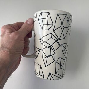 Black geometric shapes with green polka dot. 2014 release date. Microwave and dishwasher safe.