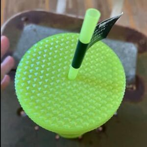 Vibrant neon green tumbler. Features textured design. Comes with matching straw. Perfect for cold beverages.