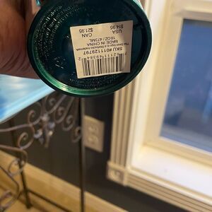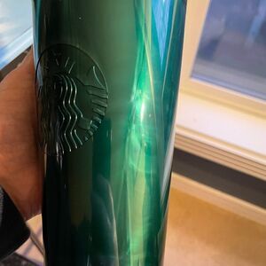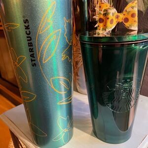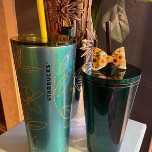 With interchangeable sunflower straw topper! Gorgeous set! The 24 ounce is metal the 16 ounce is plastic. The floral tumbler shimmers in the sun! The emerald green has a marble pattern that shines! NWT.