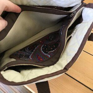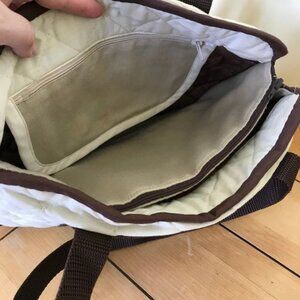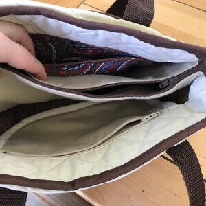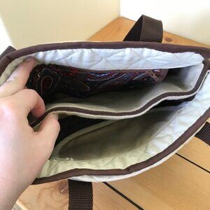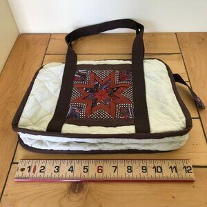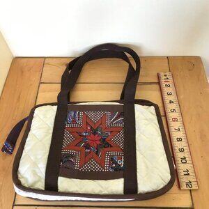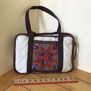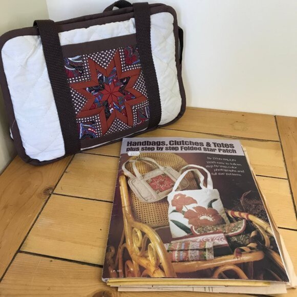 Home made quilted organizer purse is beautifully sewn with 6 compartments, including 4 with zip closures. The patchwork design on each side is a small outer pocket. Durable nylon webbing straps are 21 long. Purse is approx. 14 long x 9 wide x 3 wide. Includes the sewing patterns/booklet that were used to make the purse: Handbags, Clutches Totes plus step-by-step folded star patch by Lynn Paulin. Pre-owned condition: bag has a few spots on the outside bottom edges. Sewing patterns are cut; instruction booklet has creasing/bends.