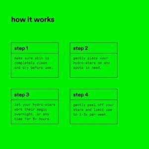 EASY TO USE: Apply to clean, dry skin. Leave on overnight (or 6+ hours). Lift off in the morning and replace with a new star, if you want. Limit use of Hydro-Star + Tea Tree to 1-3x per week.