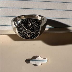 Elegant silver ring with a sunburst design. Perfect for any occasion.