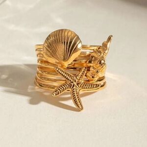Embrace the ocean's charm with this exquisite gold ring Featuring a seashell and starfish design, it's perfect for adding a touch of elegance to any outfit.