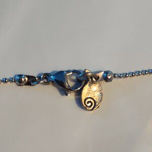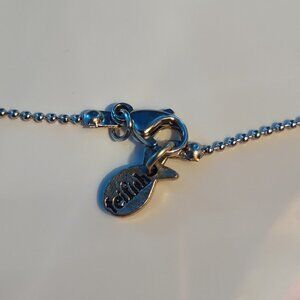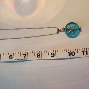 Starfish and glass Necklace by Feifish, Siver tone chain approximately 18", Starfish floats in front of a light aqua blue round glass with a textured silvery inlay inside the glass. Made by Feifish as shown on the talisman attached to the claw clip closure. Zoom in on pictures to see beautiful detail. An excellent gift for anyone who loves the sea and its wonders.