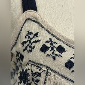 This is a women's tan gauzy textured sleeveless dress with blue embroidery from Staring at Stars, size L. This dress is lined and is in very good condition.