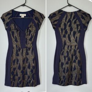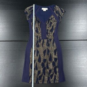 Staring at Stars Blue and Gold Silhouette Bodycon Mini Dress in size XS. Soft and breathable fabric with form hugging stretch. Gold metallic embroidered pattern. No visible signs of use. No visible flaws.