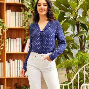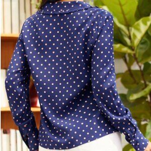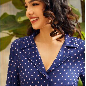A stylish upgrade to the best-selling Modcloth Camp Collar top, this long-sleeve edition sparkles with an extra hint of vintage-inspire charm! Made from a lightweight woven fabric in a navy blue hue and covered throughout in precious pink polka-dots, this adorable button-up top boasts a V-neckline with a notched label, ruffle-trimmed collar! Featuring long sleeves with button-cuff closure and a flowing, easy-fit silhouette, this 1950’s inspired blouse is so much fun to style!