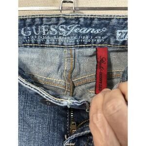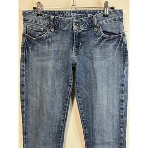 These GUESS Starlet Skinny Leg Stretch women's blue jeans feature a medium wash denim with a low rise and a 5-pocket design. The jeans have a zip and button closure, providing a comfortable and secure fit. Made of a blend of spandex and cotton, they offer stretch for ease of movement. With a waist size of 27 inches and an inseam of 31 inches, these skinny jeans in size 27 are a stylish and versatile addition to any wardrobe, perfect for various seasons and occasions with their classic design.