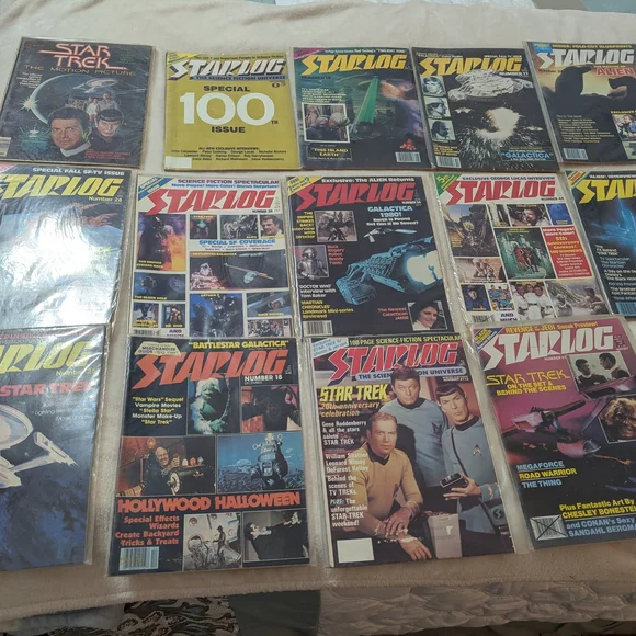 Collection of vintage Starlog magazines featuring sci-fi covers.