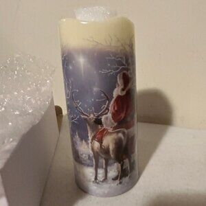 Here is a new led pillar candle. Bring the magic of Christmas Eve into your home with the Starry Night Santa Fiber Optic Candle. This enchanting design features Santa Claus and his trusty reindeer pausing in a serene, snow-covered forest. Santa gazes toward a twinkling, star-filled night sky, while the warm glow of a distant village lights up the horizon, evoking a sense of wonder and holiday cheer, Fiber optic lights add a festive sparkle to the scene, illuminating the snow and sky with a magical shimmer, while the glowing candle wick enhances the cozy ambiance. Measures 7 inch high by 3 inch wide and Requires 3 AAA Batteries that are Not included and has a Timer 6 hours on and 18 hours off , nice holiday candle and could use alone on a tabletop or shelf area or put inside a larger lantern as i show in my 1 picture. Lantern and other items not included, and check out my other holiday decor and more added weekly so check back