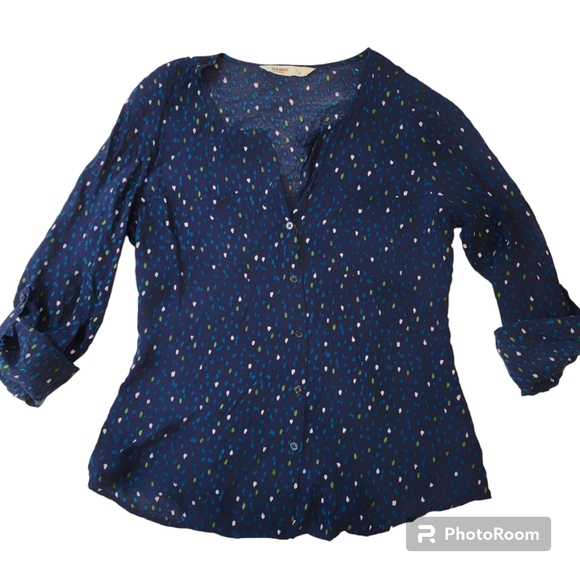 Starry night button-up top by Old Navy, size small. Midnight blue with speckled color. Semi loose fitting and button- up front. Roll-up button sleeves and can be worn as a long sleeve or 3/4 length. In excellent, like new condition. Lightweight soft material.