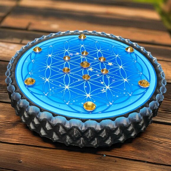 This unique, handmade, Mini Orgonite Grid has a glossy surface and features 13 sparkling Gold Crystals on top of an embedded “Starry Nights” Flower of Life Sacred Geometry Symbol. The sides have three rows of textured Diamond Edges, that have a semi-gloss finish, and there are six feet on the bottom. Set the Intention for your Grid, by adding Mini Chip Crystals to it, or you can alternately use it as an Orgonite Charger, to clear and charge any item placed on it (Crystals, Jewelry, etc.)