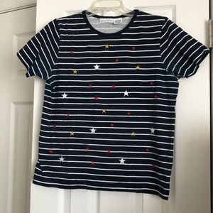 Cotton tee, navy and white stripes with embroidered stars.