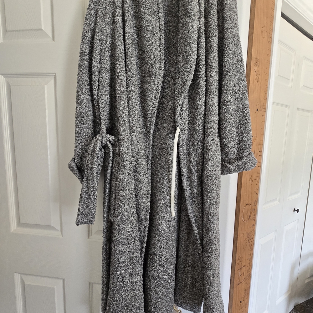 Cozy gray robe with tie belt. Soft and comfortable fabric. size tag says small but its very roomy