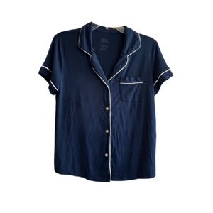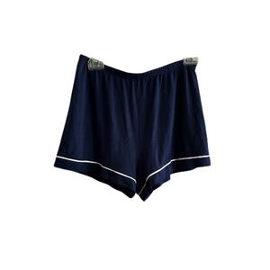 Comfortable navy pajama set. Features white trim. Short sleeves and shorts.