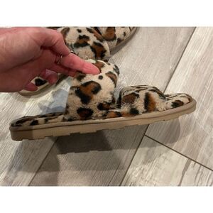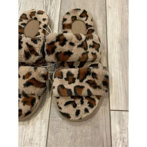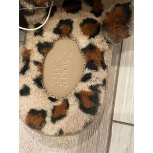 Stars above ladies, leopard double strapped fuzzy slippers with hard bottoms, size 9. New without tags. I took a couple pictures of me with a pair of my own slippers on so you could see how they fit. I normally get slippers that cover my toes, but these are so soft and fuzzy. You hardly know your toes are showing. (I normally wear a size 7 1/2/-8 in a shoe and I am wearing a size 8 in the slippers ). Smoke-free home.