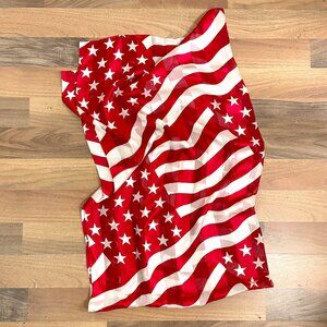 Rock your patriotic stars and stripes in red and white with this scarf. Makers tag and fiber content tags have been removed. Feels like silk or a silk blend, but we don't know for sure. Pair this up with a suffragette white shirt and you have got a true American look.