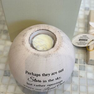 “Perhaps They Are Not Stars In The Sky, But Rather Openings Where Our Loved Ones Shine Down To Let Us Know They Are Happy" is printed onto the front of the candle holder.