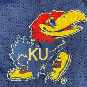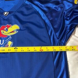 Bold blue jersey by Starter. Features Kansas Jayhawks logo on front chest and sleeves. Has KANSAS across the upper back, and colorful sleeve accents.