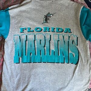 Vintage Starter brand Florida Miami Marlins retro tshirt, loose fit baggy, colored sleeves. Made in USA.