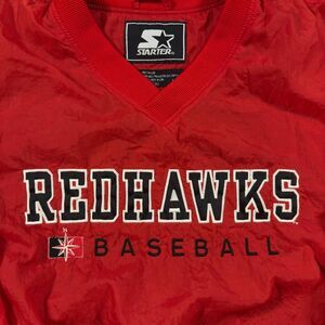 Keywords: Starter RedHawks baseball pullover, men’s large red nylon jacket, vintage Starter windbreaker, embroidered sports outerwear, 2000s baseball warmup top