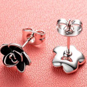 Two pairs of earrings in gold with black accents and two pairs in silver with black accents. Two pairs of roses and two pairs of flowers.