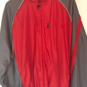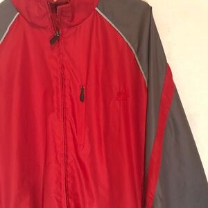 Red and grey with some white piping has zipper pockets on sides with pull draw strings on bottom of jacket like brand new