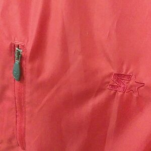 Red and grey with some white piping has zipper pockets on sides with pull draw strings on bottom of jacket like brand new